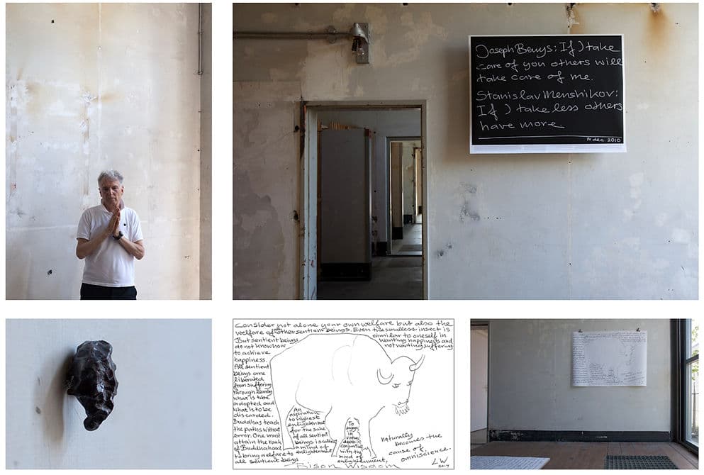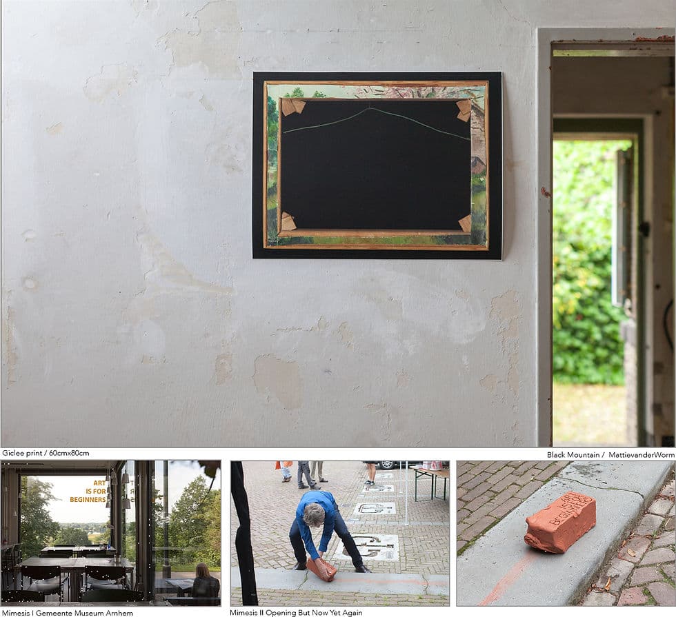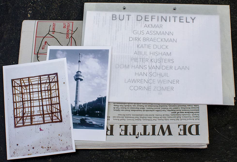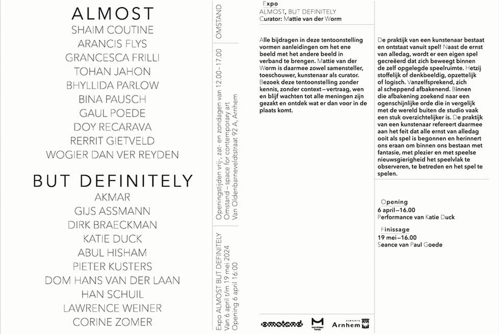 MattievanderWorm — Zowel curator, toeschouwer als mede-exposant van ALMOST BUT DEFINITELY Met dank aan OMSTAND, Gemeente Arnhem, Mondriaan fonds, Galerie ONRUST, GRIMM GALLERY Amsterdam, LAWRENCE WEINER ESTATE De praktijk van een kunstenaar bestaat en ontstaat vanuit spel! Naast de ernst van alledag, wordt er een eigen spel gecreëerd dat zich beweegt binnen de zelfopgelegde speelruimte. Hetzij stoffelijk of denkbeeldig, opzettelijk of logisch. Vanzelfsprekend, zich al scheppend afbakenend. Binnen die afbakening zoekend naar een ogenschijnlijke orde die in vergelijk met de wereld buiten de studio vaak een stuk overzichtelijker is. De praktijk van een kunstenaar refereert daarmee aan het feit dat alle ernst van alledag ooit als spel is begonnen en herinnerd ons eraan om binnen ons bestaan met fantasie, met plezier en met speelse nieuwsgierigheid het speelvlak te observeren, te betreden en het spel te spelen. In samenspraak met OMSTAND, presentatieruimte voor hedendaagse beeldende kunst te Arnhem, heeft MattievanderWorm kunstenaars uitgenodigd die zich in mijn beleving zich verhouden tot het begrip essentie. Bij de tentoonstelling ALMOST BUT DEFINITELY is een catalogus verschenen waarbij de De Witte Raaf 225 en 226 die als thema kunstenaarstijdschriften en -kunstenaarsboeken hadden, als verzamelmap is gebruikt. Oplage 100. Met dank aan AKMAR / Gijs Assmann / Dirk Braeckman / Katie Duck / Abul Hisham / Pieter Kusters / Dom Hans van der Laan / Han Schuil / Lawrence Weiner / Corine Zomer / Corine van der Wal en Rob Groot Zevert. Met dank aan OMSTAND, Gemeente Arnhem, Mondriaan fonds, Galerie ONRUST, GRIMM GALLERY Amsterdam, LAWRENCE WEINER ESTATE / De Witte Raaf